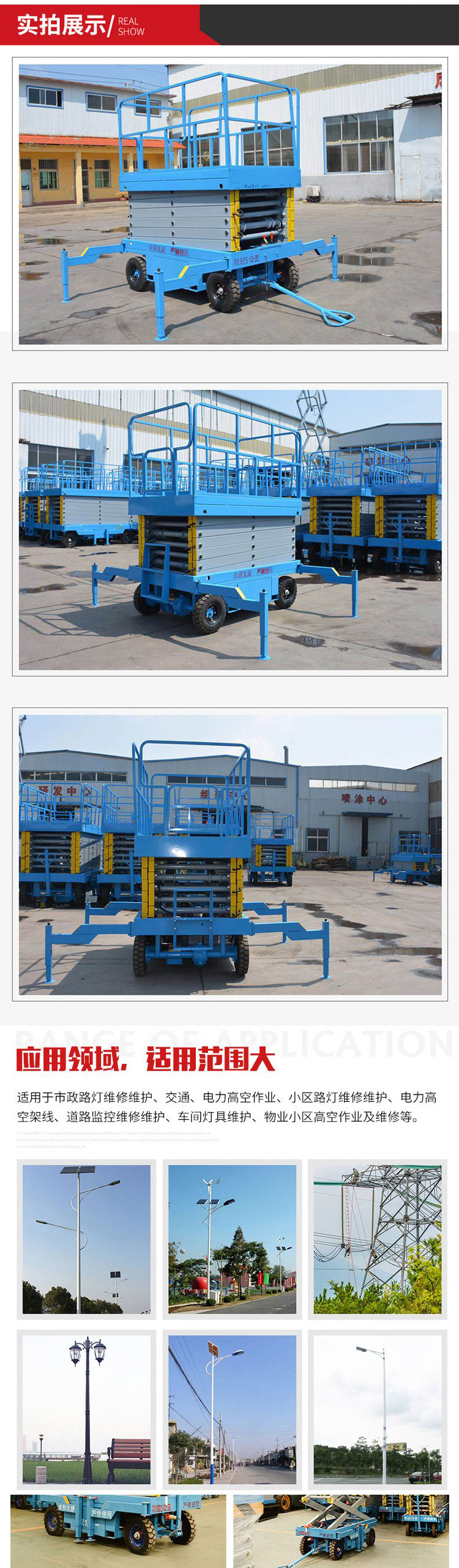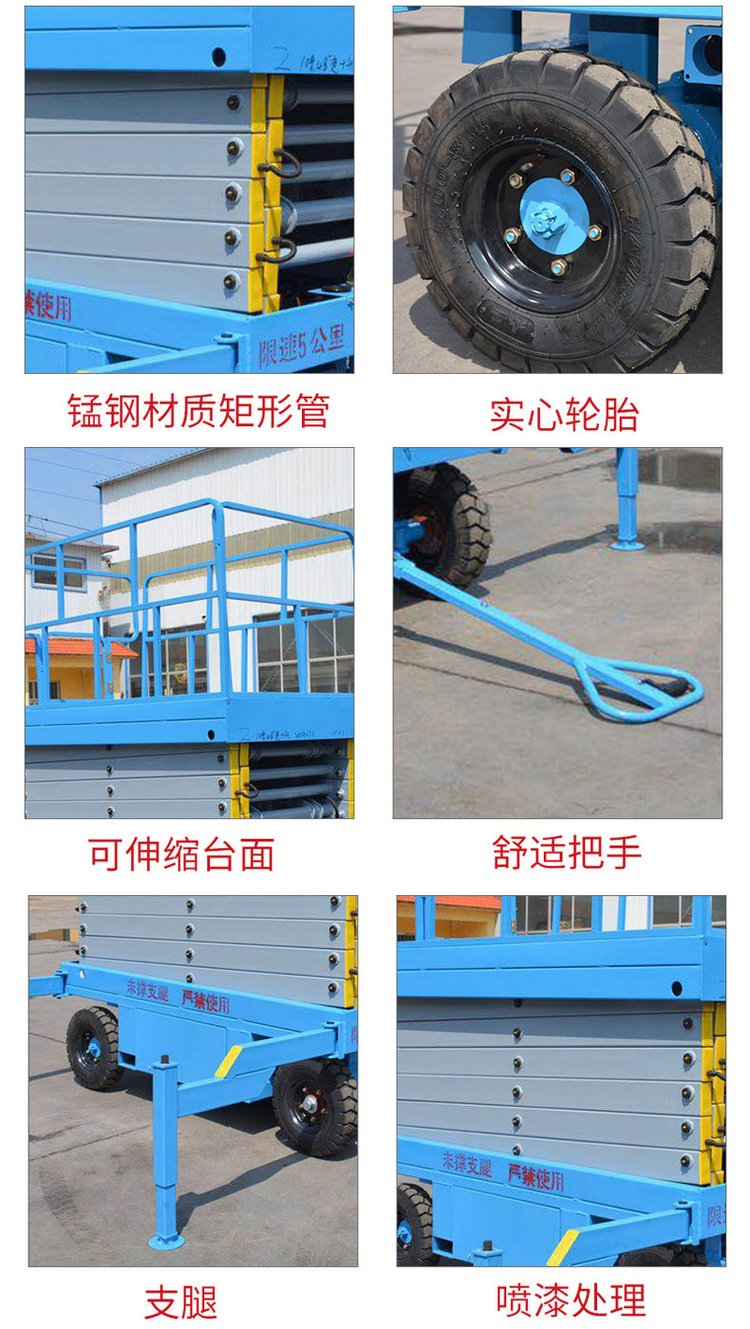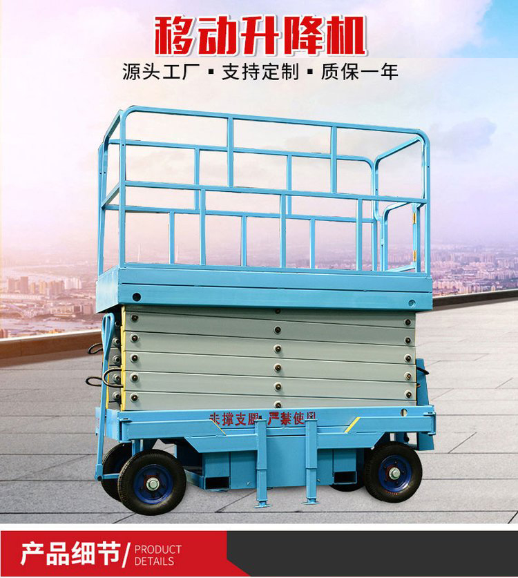 移動升降機根據需求可選為二相、三相、電瓶、柴油機為升降動力,特殊場所也可選用防爆電機,電器等。該升降機控制方式為電動上、下控制升降,手、電兩用或遙控器控制,在停電時仍可使用。該系列升降機具有移動靈活,升降平穩,載重量大,操作方便等特點,移動升降機廣泛用于工廠、糧庫、機場、加油站、機關、碼頭、野外電力、路燈維護及建筑裝修等各種行業。移動升降機可根據用戶使用要求設計制造。