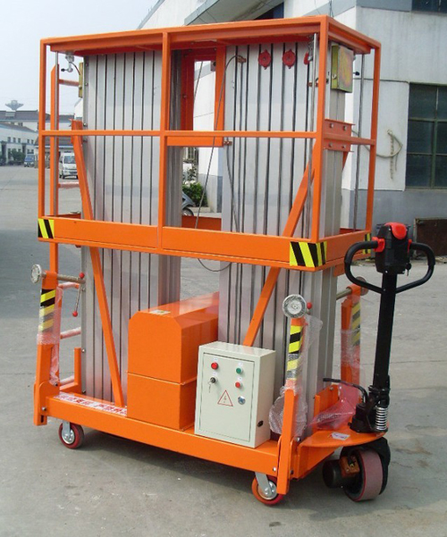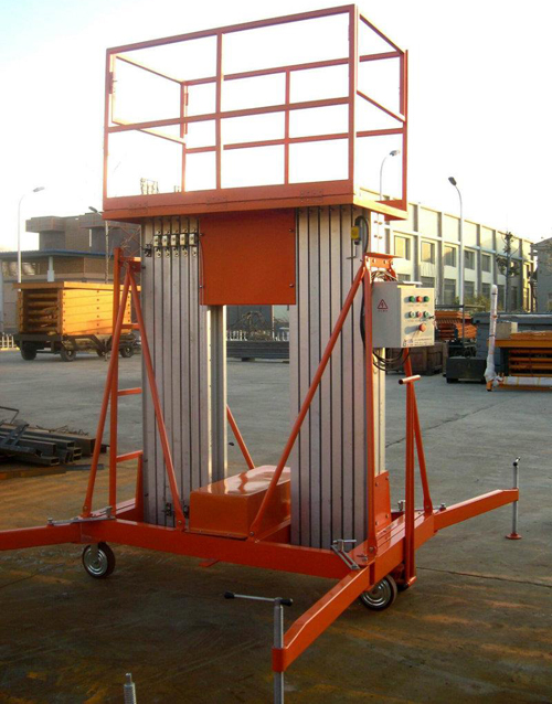 鋁合金升降機整機重量輕,機動性好,適合單人操作;特制的桅柱間導輪裝置,升降平穩自如;結構緊湊,運輸狀態尺寸小,可進入一般電梯的轎廂以及能順利通過門洞和狹小通道;雙重保護的支腿結構,工作更安全,且可貼近工作面升降作業;根據使用場所高的要求,可做成手動放到或電動放到式升降平臺。以滿足門口比較低時使鋁合金升降平臺無法進入的情況。