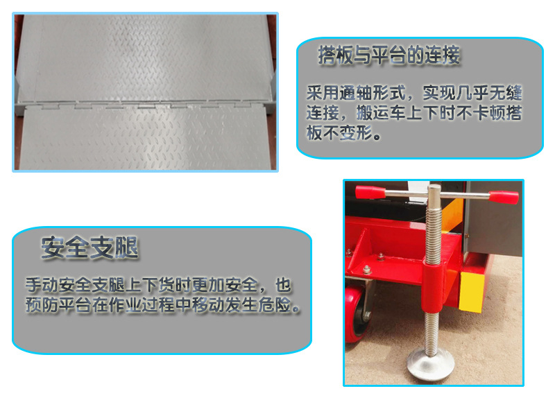 3.裝卸平臺機架后部設有可調節鏍絲桿支撐地面,用于裝卸貨作業時起到整體固定作用;